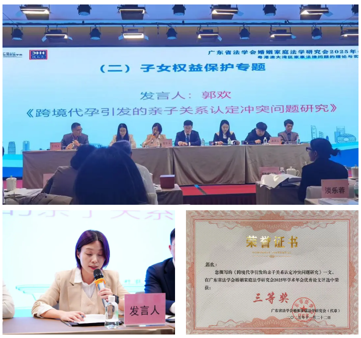 在此次会议中,郭欢律师凭借其撰写的《跨境代孕引发的亲子关系认定冲突问题研究》一文,在年会优秀论文评选中荣获三等奖。郭欢律师在年会“子女权益保护专题”环节进行了精彩的论文成果分享。她结合粤港澳大湾区跨境法律实务的特点,深入剖析了跨境代孕背景下亲子关系认定的法律冲突问题,从法律理论、实务案例、解决方案等多个维度展开论述,其专业的分析和独到的见解获得了现场专家学者的高度认可。