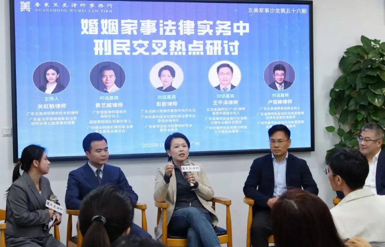 2025年11月20日,五美家事系列沙龙第五十六期“婚姻家事法律实务中的刑民交叉热点研讨”沙龙在广东五美律师事务所成功举办。本次研讨会特邀刑事、执行及婚姻家事专业领域资深律师——广东法纳川穹律师事务所执行主任彭歆律师、广东国智律师事务所高级合伙人黄艺威律师、北京金诚同达(广州)律师事务所高级合伙人王平泽律师、以及广东五美律师事务所合伙人卢俊峰律师出席活动,活动由广东五美律师事务所关虹敏律师担任主持。