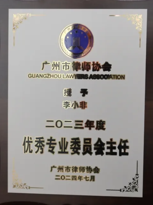 李小非律师在第十届广州市律师协会中担任广州市律师协会婚姻家事法律专业委员会主任职务,任职期间带领婚姻家事法律专业委员会三次荣获“优秀专业委员会”的荣誉、李小非律师本人三次荣获“优秀专业委员会主任”的荣誉。