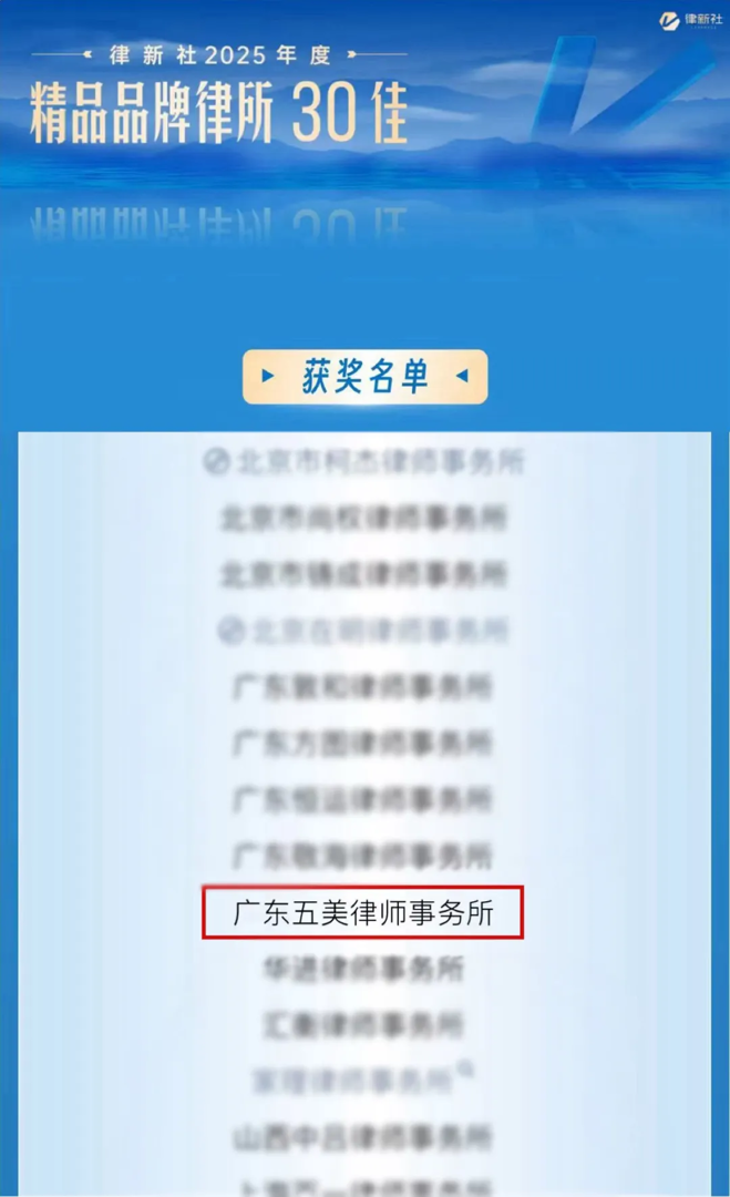 2026年3月,“东方潮涌 到世界去”第四届法律服务业品牌发展论坛暨律新社2026品牌盛典隆重举行,现场发布律新社《律所卓越品牌影响力指南(2025)》,广东五美律师事务所凭借出色的专业能力荣登“律新社2025年度精品品牌律所30佳”榜单。