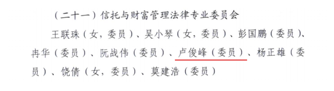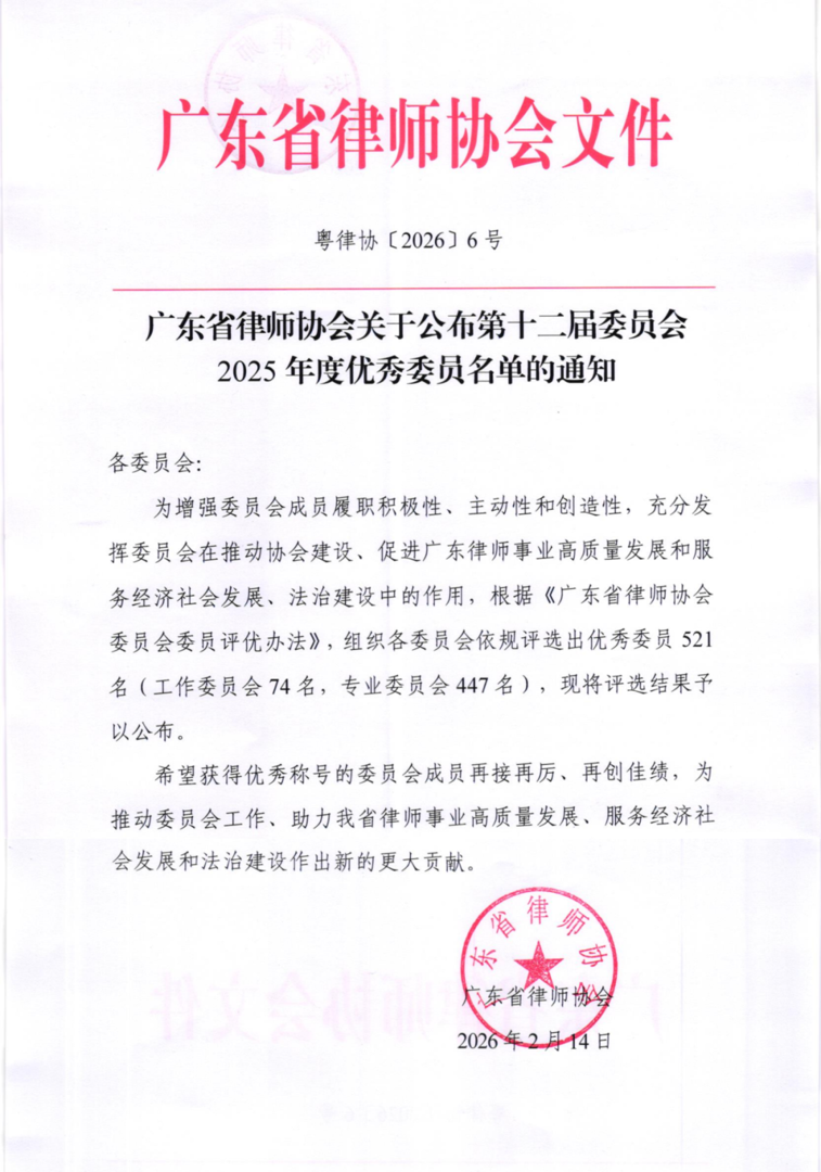 为增强委员会成员履职积极性,主动性和创造性,充分发挥委员会在推动协会建设、促进广东律师事业高质量发展和服务经济社会发展、法治建设中的作用,2026年2月14日广东省律师协会公布第十二届委员会2025年度优秀委员名单。 广东五美律师事务所主任、广东省律师协会婚姻家事法律专业委员会副主任李小非律师荣获婚姻家事法律专业委员会优秀委员。 广东五美律师事务所合伙人卢俊峰律师荣获信托与财富管理法律专业委员会优秀委员。